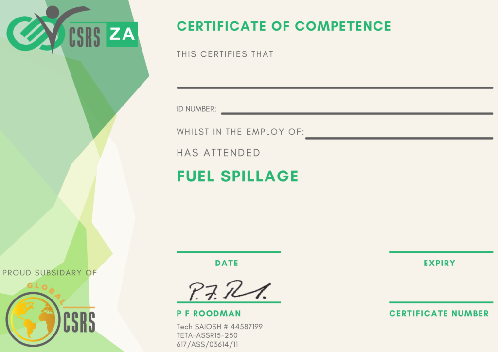 Service Station – Fuel Spillage Training Course Peter RoodmanNovember 6, 2021 Current Status Not Enrolled Price $R 320.00 Get Started Take this Course Fuel Spillage - Basic understanding of responding to dangerous or environmentally damaging spills Training Course Credible Content This course has been developed by industry experts to make sure that you are well oriented. certificate on completion You will be issued an Accredited Certificate on completion once you are found competent. Learn at your own pace This course can be completed in your own time, without the need to finish it all in one sitting. Fully digital This course can be completed fully online, without the need for face-to-face training. Feedback A final assessment is placed at the end of the course to provide feedback as an indication of understanding. Mobile friendly This training programme can be completed on any mobile device, including phones and pads. Price R320.00 Purchase Purchase Course description This course aims to guide and assist in the basic understanding of responding to dangerous or environmentally damaging spills. Key concepts covered in the course To arm your team with a basic understanding on how to respond to an incident where a potentially dangerous or environmentally damaging spill has occurred, Know the correct procedure and how to use a spill kit correctly The correct PPE as it is very important to prevent or minimize the level of exposure of the spill. Provide up to date information & legislation on the dangers of why a spill kit is required and when it is necessary to use a spill kit. Course Overview Introduction This course aims to guide and assist in the basic understanding of responding to dangerous or environmentally damaging spills. Course Structure The course is divided into 18 lesson. You will then be given an opportunity to tackle the Final Quiz.To pass this course, you will need to complete the Final Quiz with a mark of at least 80%. What You Will Cover Safe Handling of Fuel ProductsDangers of FuelHSEQ SignageHazards of FuelEnvironmental HazardsSafety PrecautionsProtection against Safety HazardsReport Safety HazardsFilling ContainersPreventing Fuel SpillageSafety Precautions for Dealing with SpillagesHousekeepingDealing with SpillagesSpill ControlSpill ContainmentSpill Clean UpEnvironmentConclusion Requirements An active internet connection What our clients say 5/5 "After acquiring an understanding on the matter, my entire workplace has become a much safer environment, resulting in the overall happiness of my employees increasing." "This course was easy to navigate, even for me with my limited computer literacy. I was able to update my knowledge base in an easy way, all from the comfort of my own home – staying COVID safe." "This training course allowed me to gain a complete understanding, enabling us to fully comply with all rules. I would recommend this course to anyone that wants a well-rounded overall understanding on what they should be doing." Price R320.00 Purchase Purchase