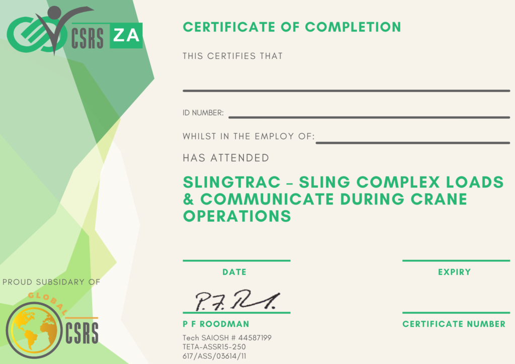 OHS Part S – SLINGTRAC – Sling Complex Loads & Communicate during Crane Operations Training Course Peter RoodmanApril 11, 2022 Current Status Not Enrolled Price $R 1,950.00 Get Started Take this Course SLINGTRAC – Sling Complex Loads & Communicate during Crane Operations Training Course Credible Content This course has been developed by industry experts to make sure that you are well oriented. certificate on completion You will be issued an Accredited Certificate on completion once you are found competent. Learn at your own pace This course can be completed in your own time, without the need to finish it all in one sitting. Fully digital This course can be completed fully online, without the need for face-to-face training. Feedback A final assessment is placed at the end of the course to provide feedback as an indication of understanding. Mobile friendly This training programme can be completed on any mobile device, including phones and pads. Price R1,950.00 Purchase Purchase Course description Sling complex loads and communicate during crane operations Key concepts covered in the course Demonstrating an integrated practical and theoretical grounding in Crane Operations, inspecting and evaluating lifting gear, preparing and slinging complex loads, as well as communicating during crane operations The contribution to The National Skills Development Strategy is the key developmental interface between learners and new competencies to be achieved. Learners who master the applied competence described in this unit standard will contribute to the development of a professional community of Civil Engineering Construction Crane Operators who are able to competently use science and technology when applying operation techniques. The contribution to socio-economic transformation is that learners will be able to undergo RPL-assessment and thereby receive recognition for previous learning and experience. This in turn will enhance the employability and career prospects of learners employed in this sector. Course Overview Introduction Sling complex loads and communicate during crane operations Course Structure The course is divided into 2 lesson. You will then be given an opportunity to tackle the Final Quiz.To pass this course, you will need to complete the Final Quiz with a mark of at least 80%. What You Will Cover Introduction to SAQA, NQF & SETASling Complex Loads IntroductionDetermine Weight LoadsSelecting Weight EquipmentCompetent PersonThe Lifting Tackle InspectorComplex LiftCranes and Hoists SignalsAudible Communicationconclusion Requirements An active internet connectionNQF Level 2 NumeracyNQF Level 2 Literacy The operator should be declared physically fit and have completed an eyesight test (such as the Orthorator test, the Purdue University Test No. 3, etc.) and an industry recognised depth perception and hand-eye co-ordination test.It is assumed that people starting to learn towards this unit are competent in unit standards which addressSling and Communicate During Crane Operations – NQF Level 2. What our clients say 5/5 "After acquiring an understanding on the matter, my entire workplace has become a much safer environment, resulting in the overall happiness of my employees increasing." "This course was easy to navigate, even for me with my limited computer literacy. I was able to update my knowledge base in an easy way, all from the comfort of my own home – staying COVID safe." "This training course allowed me to gain a complete understanding, enabling us to fully comply with all rules. I would recommend this course to anyone that wants a well-rounded overall understanding on what they should be doing." Price R1,950.00 Purchase Purchase